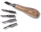 Rydla na linoryt výbornej kvality. Rydla na linoryt LUKAS s drevenou rukoväťou a s 5 rôzne tvarovanými oceľovými nožmi/ rydlami (V i U profil, kontúry). Jednotlivé nože ľahko osadíte do drevenej rukoväti. Cena za balenie.